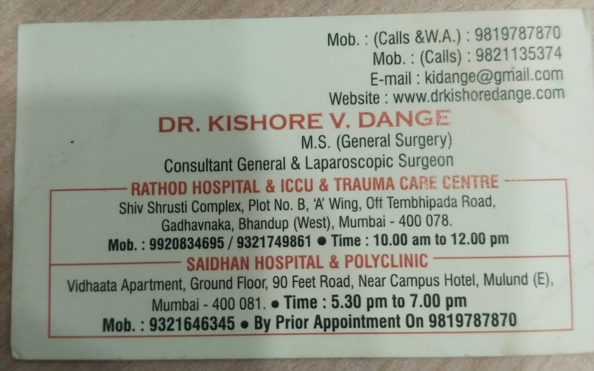 Dr. Kishore V. Dange is a highly experienced and dedicated medical professional committed to delivering advanced healthcare with compassion and precision. With years of clinical expertise and a patient-centric approach, Dr. Dange has built a reputation for offering reliable diagnosis, effective treatment, and personalized care tailored to each patient’s needs. He combines modern medical techniques with ethical practices to ensure the best outcomes for his patients. Dr. Dange’s vision is to make quality healthcare accessible while maintaining the highest standards of professionalism, trust, and transparency. Why Choose Dr. Kishore V. Dange? Experienced and trusted medical professional Comprehensive treatment approach with modern facilities Patient-friendly care with individual attention Commitment to ethical and transparent medical practices.